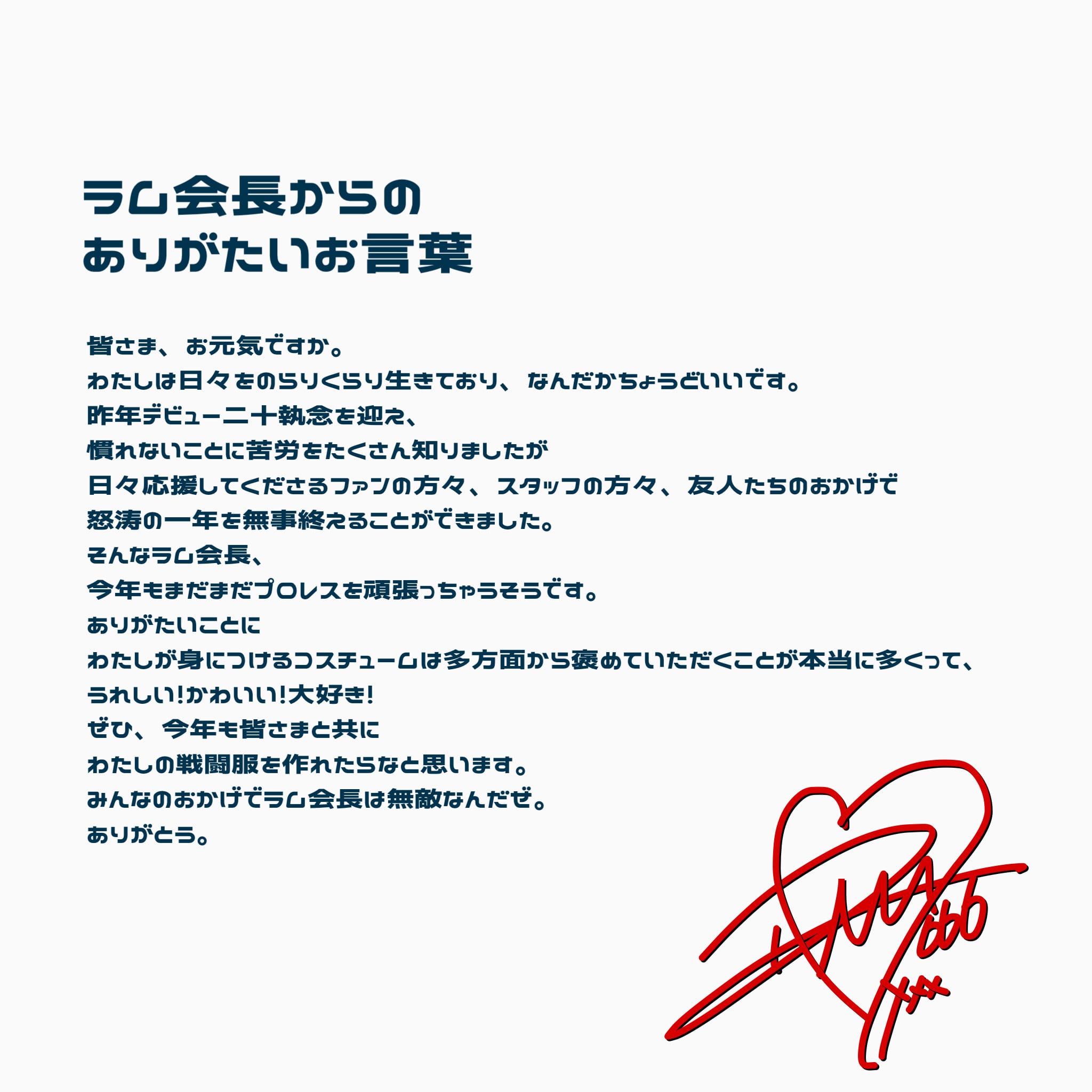 ラム会長が今年2026年、更に女子プロレスラーとして飛躍する為に新規コスチュームを製作するにあたり、一口コスチュームスポンサーを募集いたします。